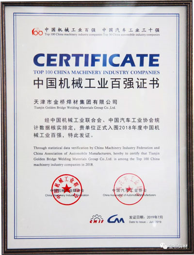 金橋焊材集團(tuán)榮獲2018年中國(guó)機(jī)械工業(yè)百強(qiáng)企業(yè)稱號(hào)