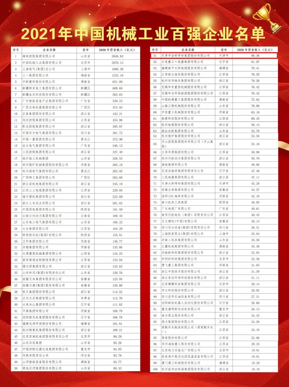 位列51名!天津金橋焊材集團上榜機械工程百強名單