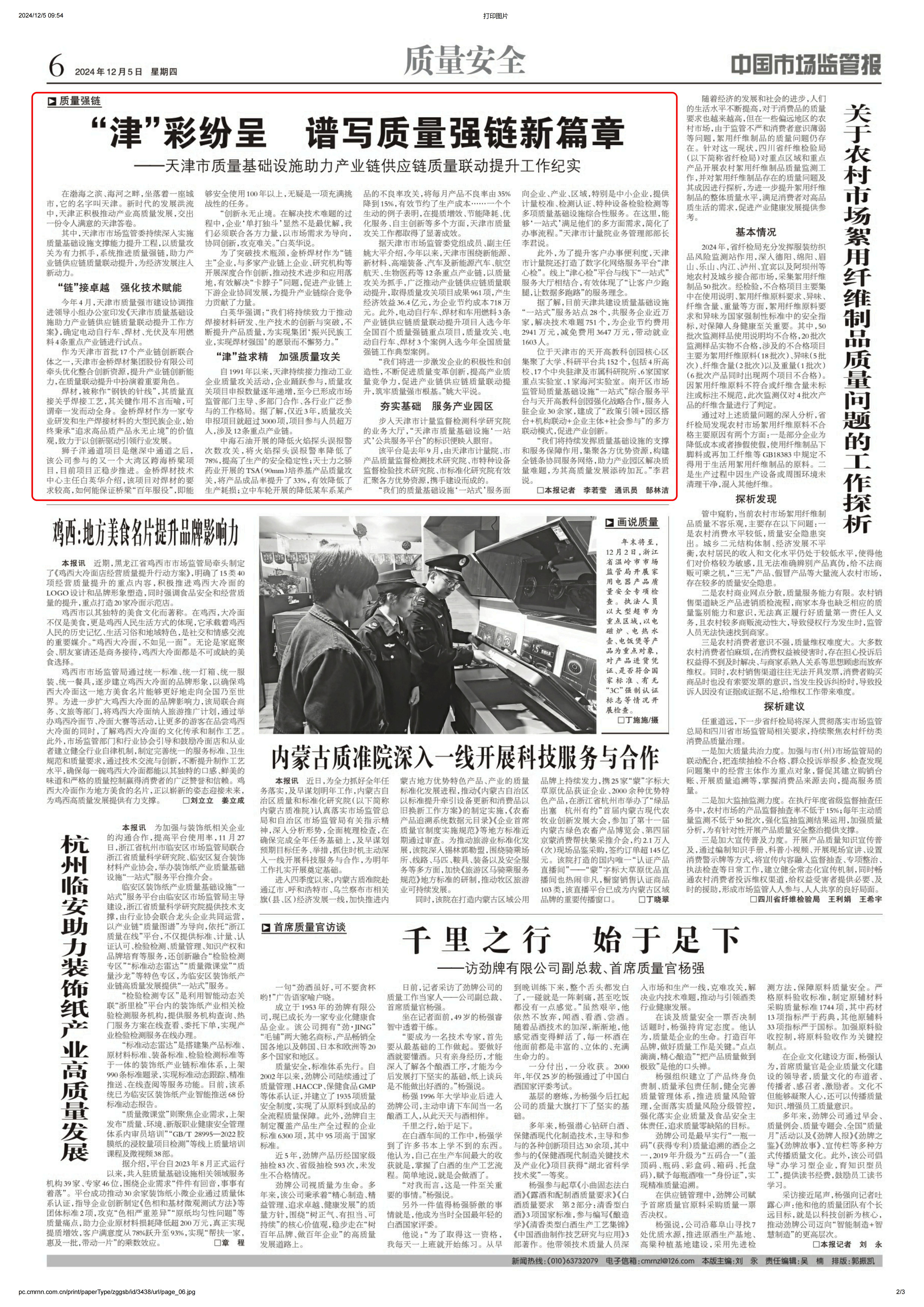 其中,天津市市場(chǎng)監(jiān)管委持續(xù)深入實(shí)施質(zhì)量基礎(chǔ)設(shè)施支撐能力提升工程,以質(zhì)量攻關(guān)為有力抓手,系統(tǒng)推進(jìn)質(zhì)量強(qiáng)鏈,助力產(chǎn)業(yè)鏈供應(yīng)鏈質(zhì)量聯(lián)動(dòng)提升,為經(jīng)濟(jì)發(fā)展注入新動(dòng)力。